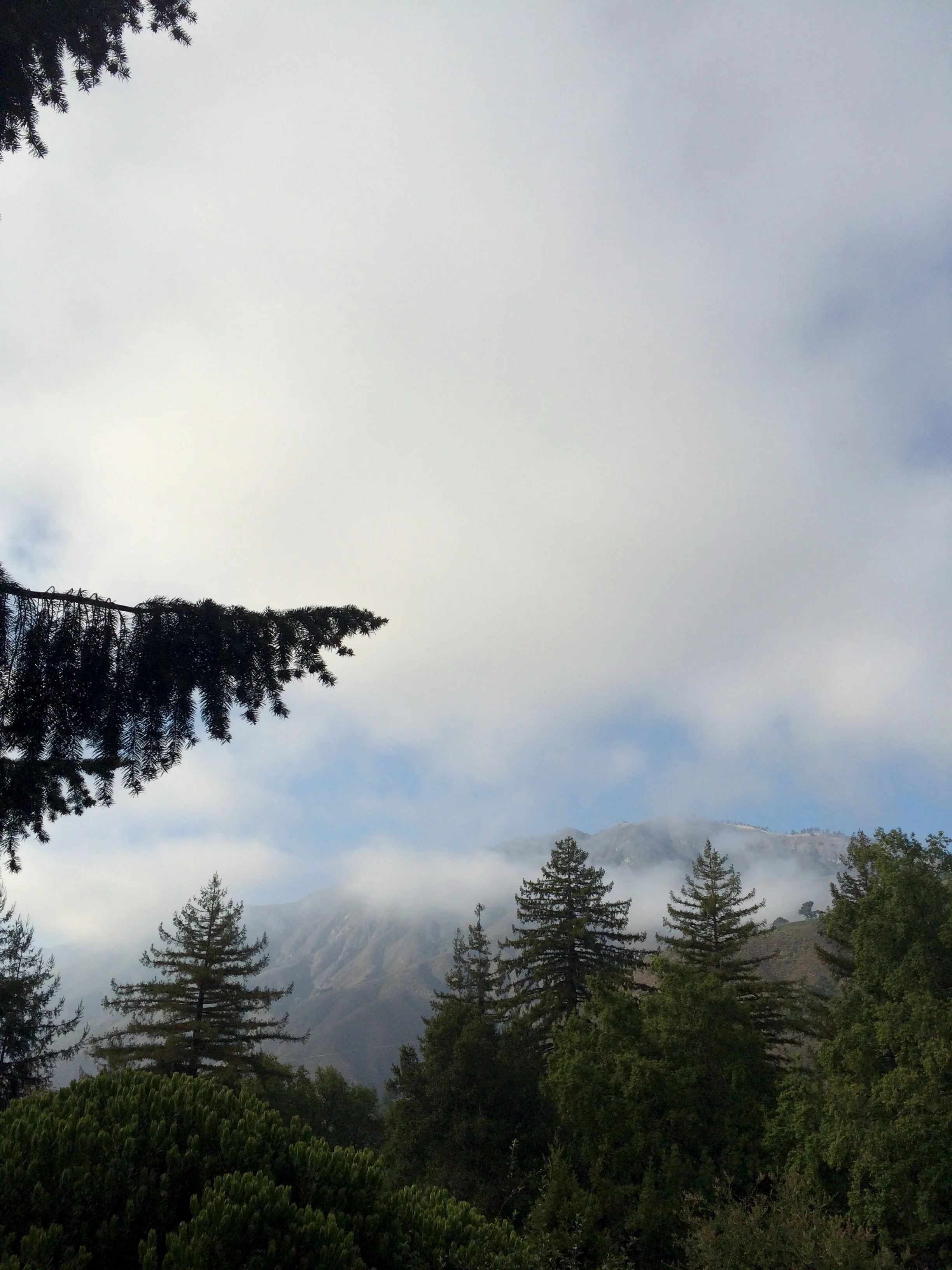 Up and up the 1, clouds and cliffs on either side, things becoming steadily more Big Sur-ish with steepening precipices and proliferative Monterey cypress. We paused at one pullout where some surfers were suited up and descending a trail, but Rama opted to put that on hold since we had not yet figured out camp lodgings and it was still the tail end of the peak season (though schoolyears starting had us optimistic).