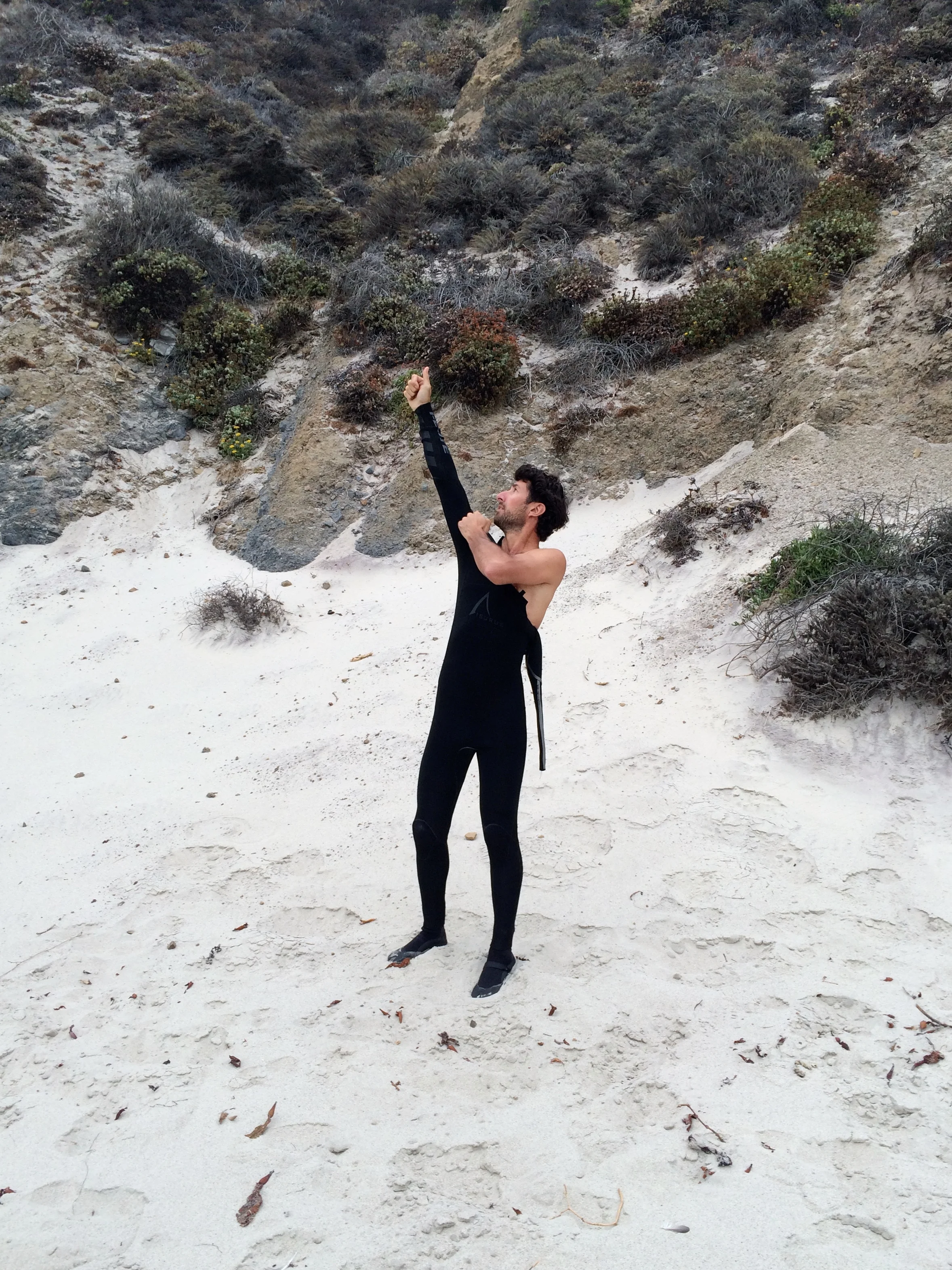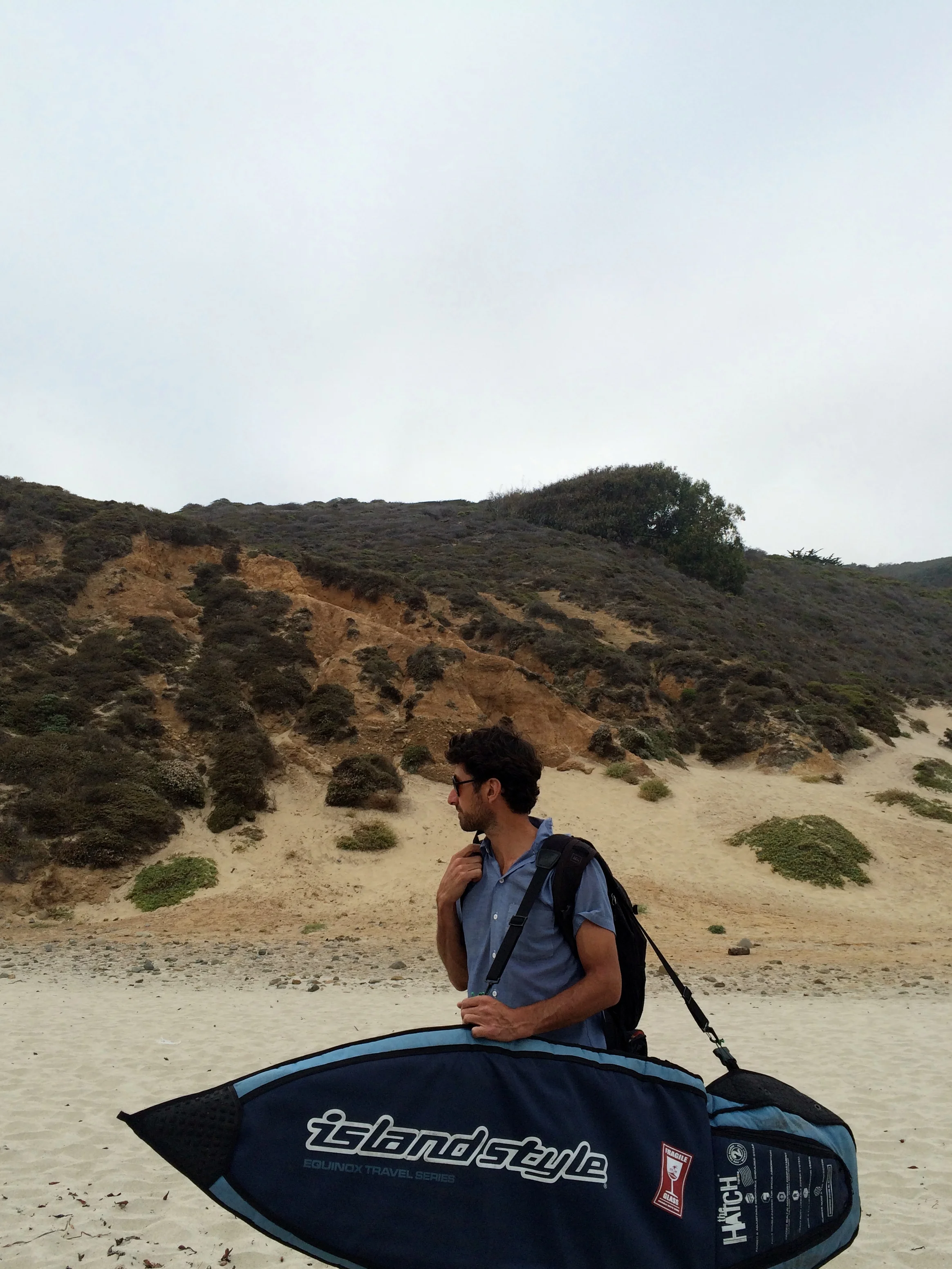 Another jot and we were at Pfeiffer Beach. We emerged through the cypress onto the sand, watched a couple surfers toiling unsuccessfully in the little cove to the left of the iconic rock archway, and then headed to the other side of the rocks where Rama saw some promising waves and only one guy in the water.