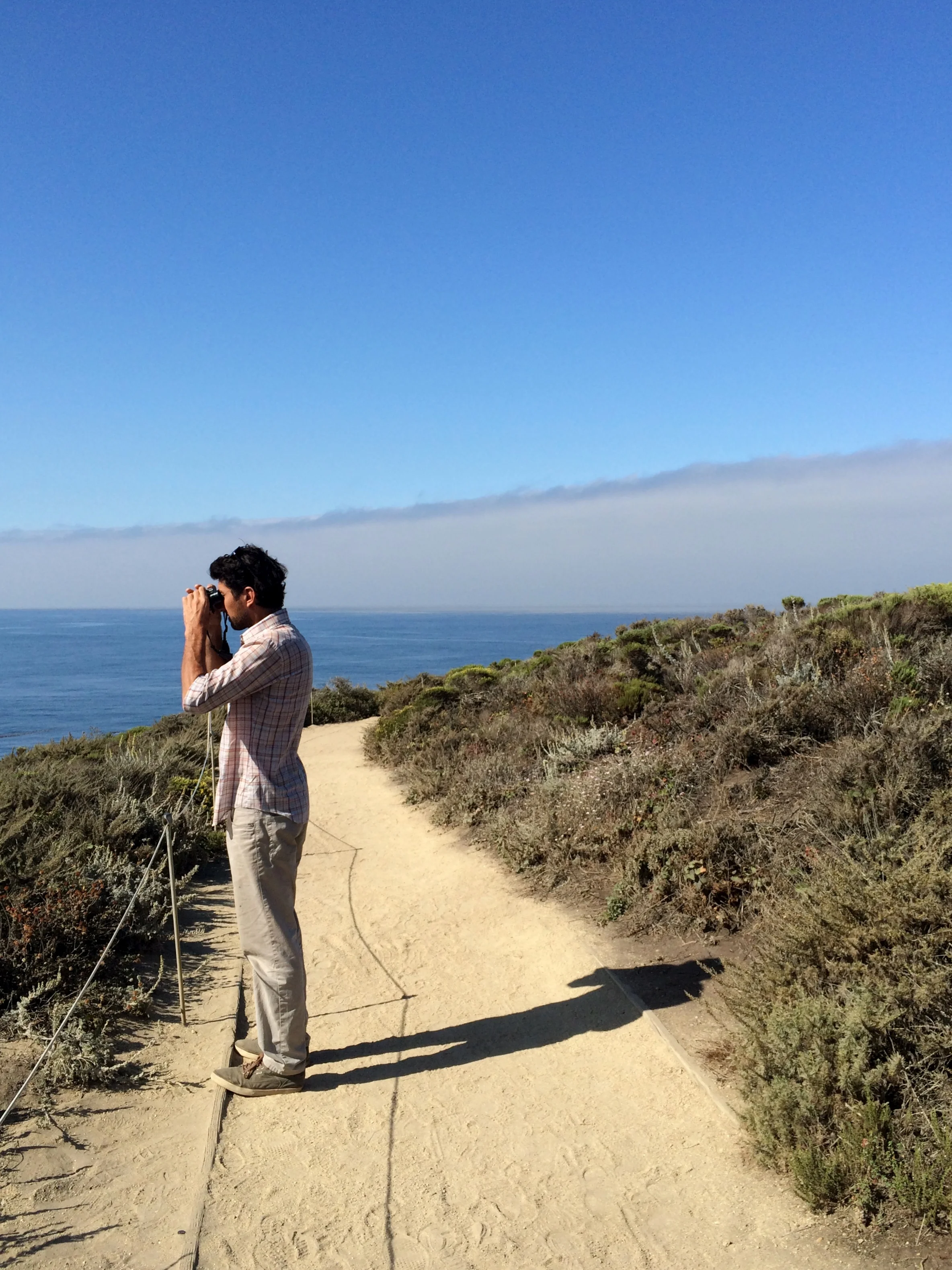 We stopped at Point Lobos, which I'd visited on a fam trip years earlier and remembered positively. Free parking with our camping slip (woop woop), and there was a docent there lending out binoculars so people could watch the otters. We'd been spoiled seeing one up close and personal in San Simeon a few days earlier, but Rama handed over his driver's license and we walked the short dirt loop check them out. There were two of them docked in the middle of a seaweed tangle, which they apparently do to rest and sleep without drifting out to sea.