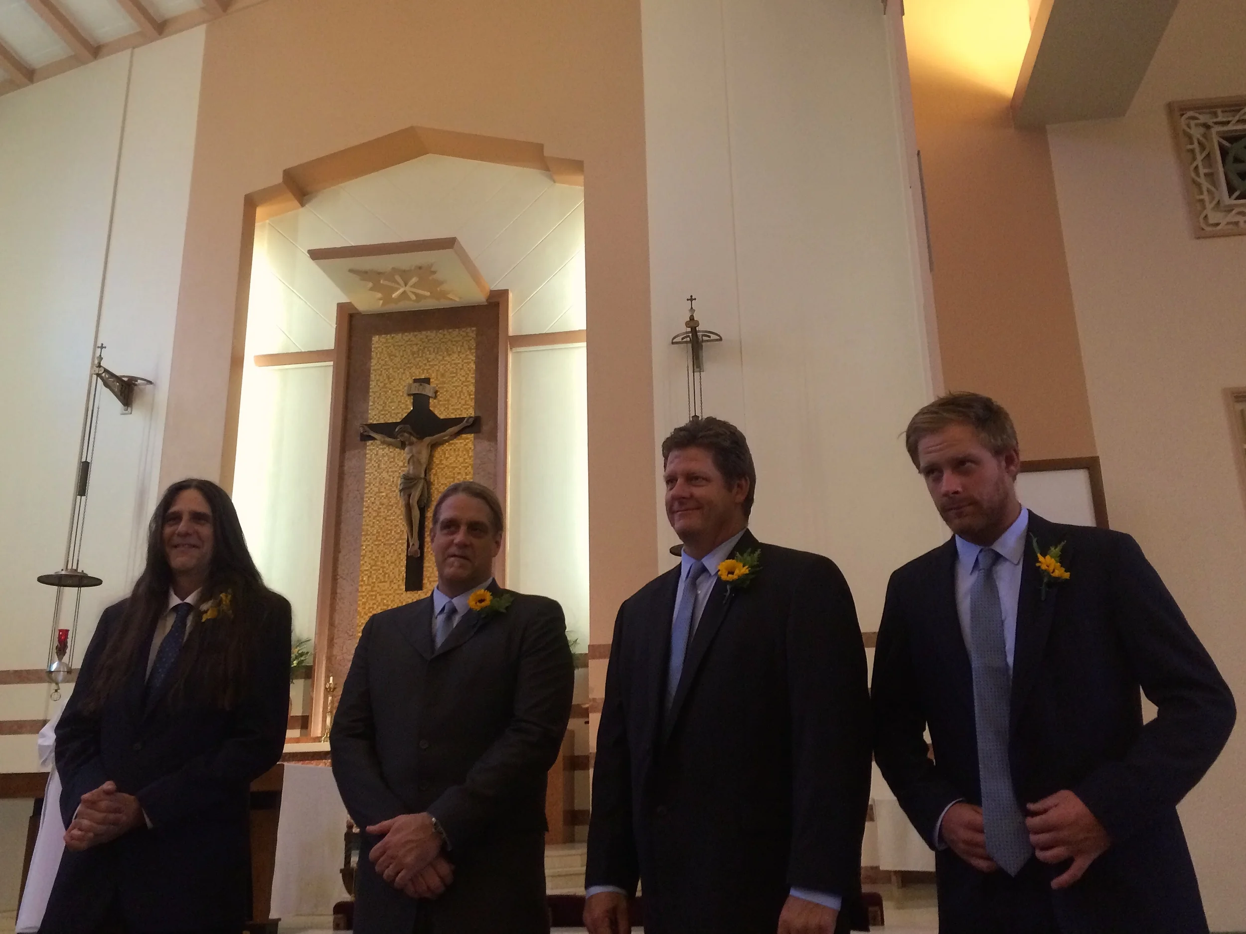 The beach was garjuhssly golden, and I took pics and then settled down with my book and blanket. R didn't have too much luck surfing (too many folks flocking to catch a hurricane-caused South swell), and when he was done I jumped in with him and then we went home to shower and get gussied. We naturally left the house later than planned and LA traffic was of course total crap. I was supposed to read the Prayer of the Faithful in the ceremony and started bugging out about the time, but thank Christ we made it (with not a minute to spare mind you). The church was very pretty, and it was really sweet seeing my bros all lined up in their suits.