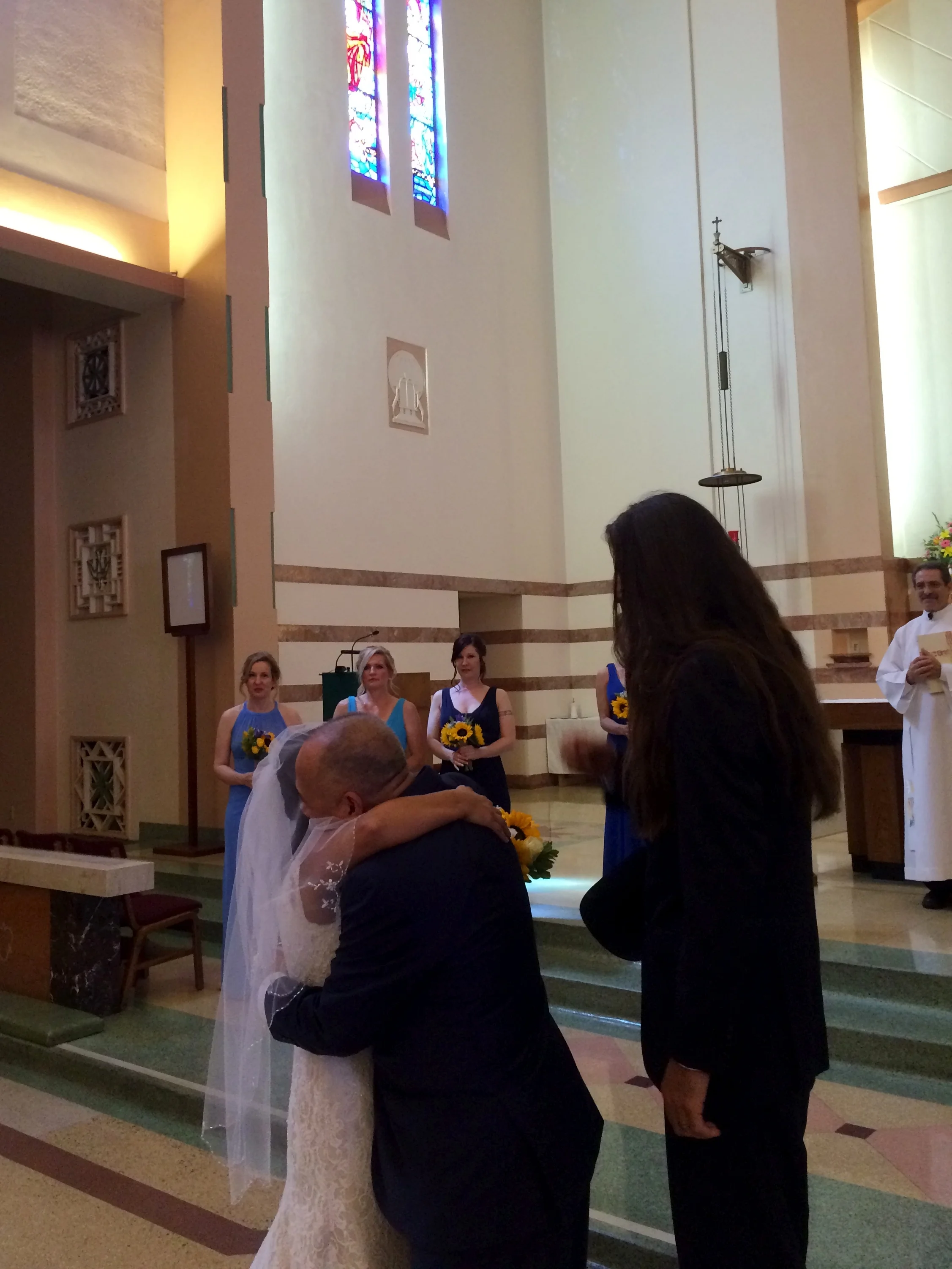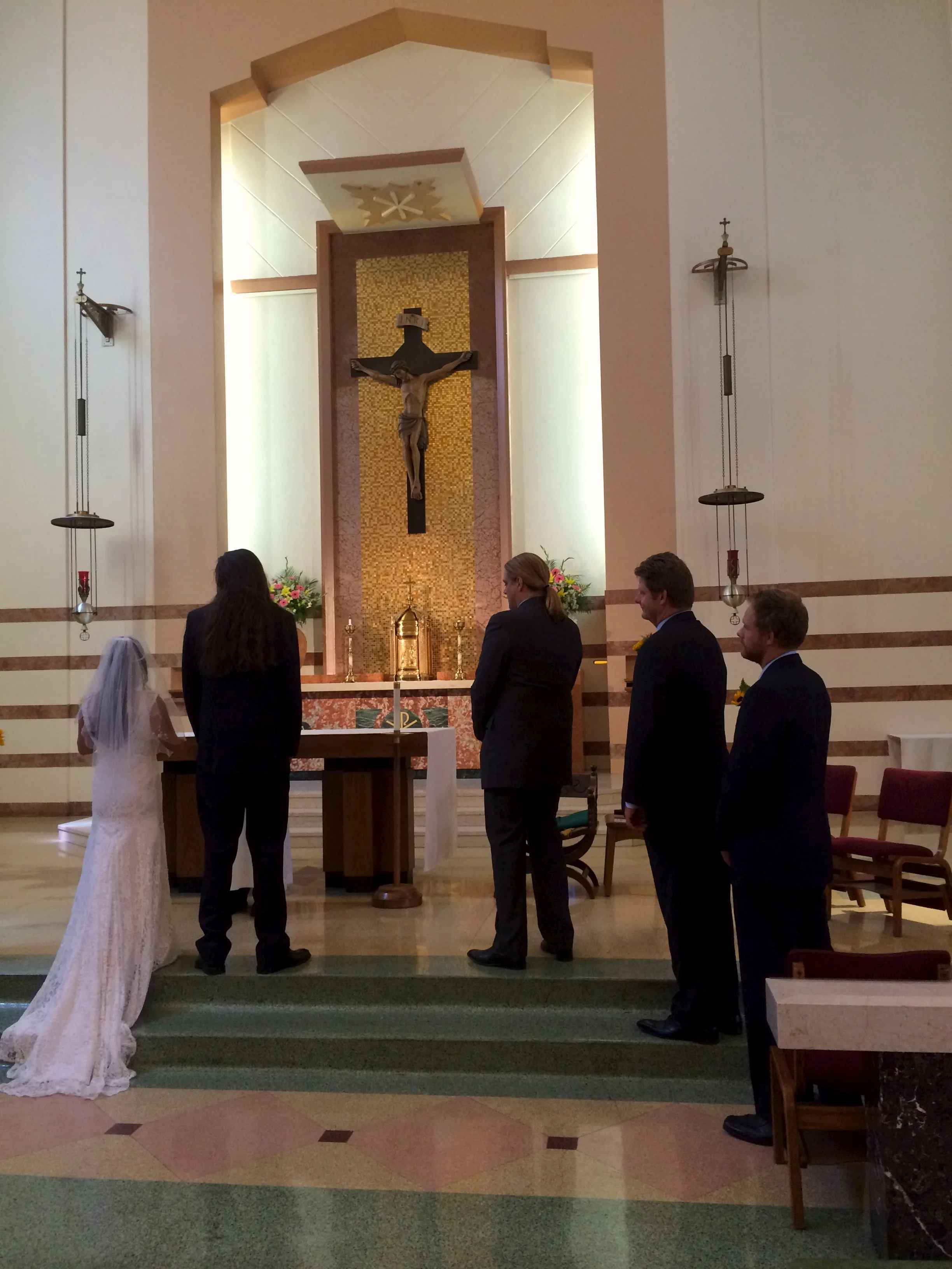 Maria, the bride, was utterly lovely, which is a cliché but she was and is. The ceremony was pretty short considering it was a Catholic affair--there was a little sexist Bible bullshit, but for the most part it was fine and then fin. Eric and Maria cut a striking pair--even with her high, high, high heels he towered over her. They both seemed very happy and earnest.