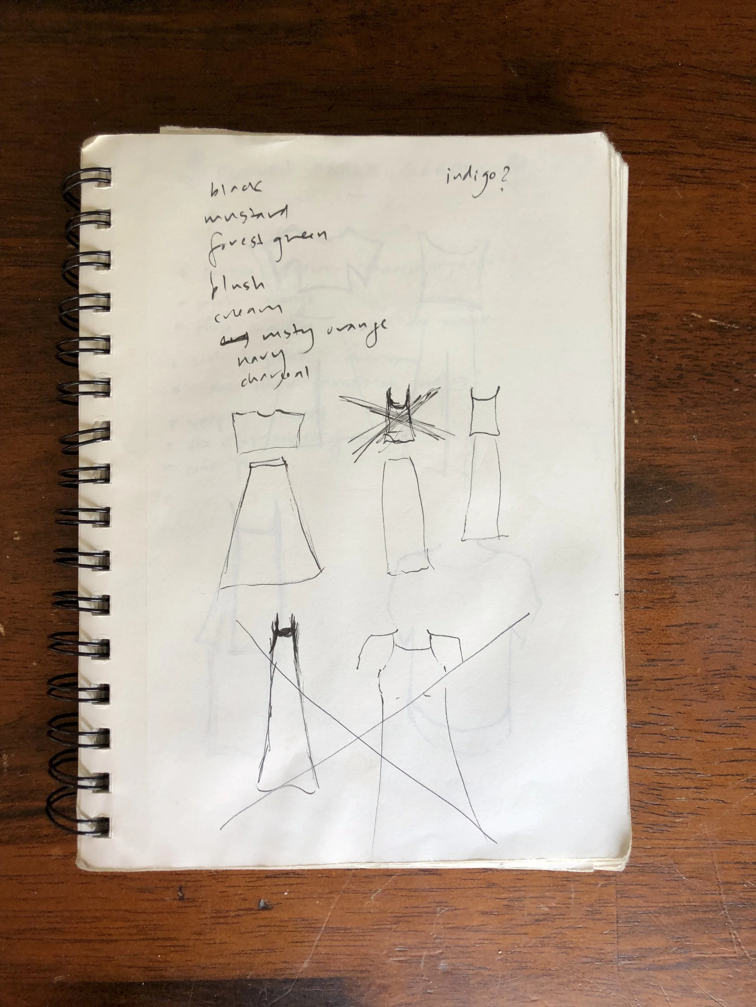 I also—and this is my pipingest most frivolous fancy of them all—have a little fantasy of making a collection of clothes: simply cut separates in a lovely swath of colors that could be combined over many variations, sort of a minimalist uniform. I have the idea of five different cuts for the tops, then two different skirts and two different pants.